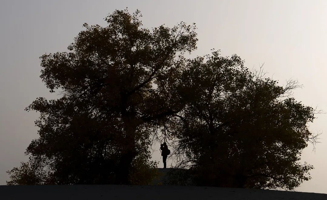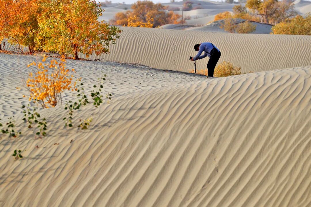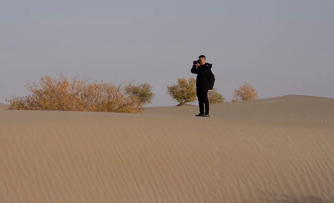 10月23日,在新疆生产建设兵团第一师阿拉尔市的G580国道阿拉尔至和田沙漠公路(简称“阿和公路”)附近,一名男子正在拍摄胡杨林。金秋十月,新疆生产建设兵团第一师阿拉尔市的胡杨林迎来了最佳观赏季。中国旅游报记者陈晨 摄