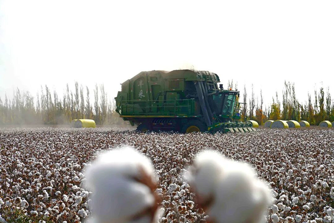 10月25日,第一师阿拉尔市十二团塔南镇十五连的棉花种植基地,大型采棉机一边采收一边将棉花打包成捆。科普时报记者季春红 摄