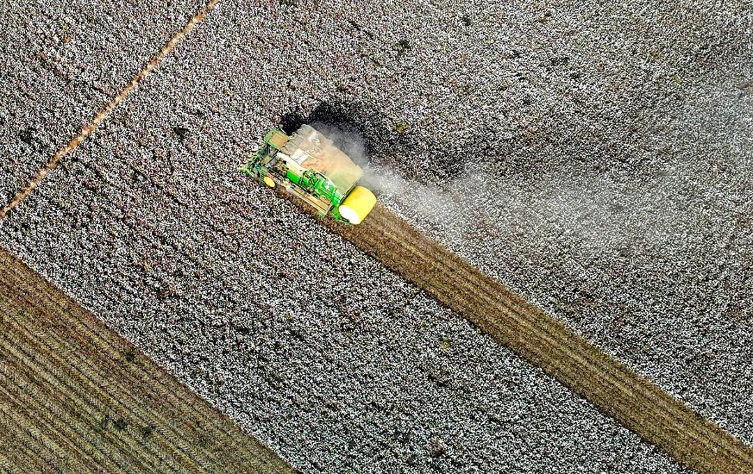 十月的新疆是收获的季节,在兵团一师管辖地,大型机械在收割棉花并打捆待运。赵树宴 摄