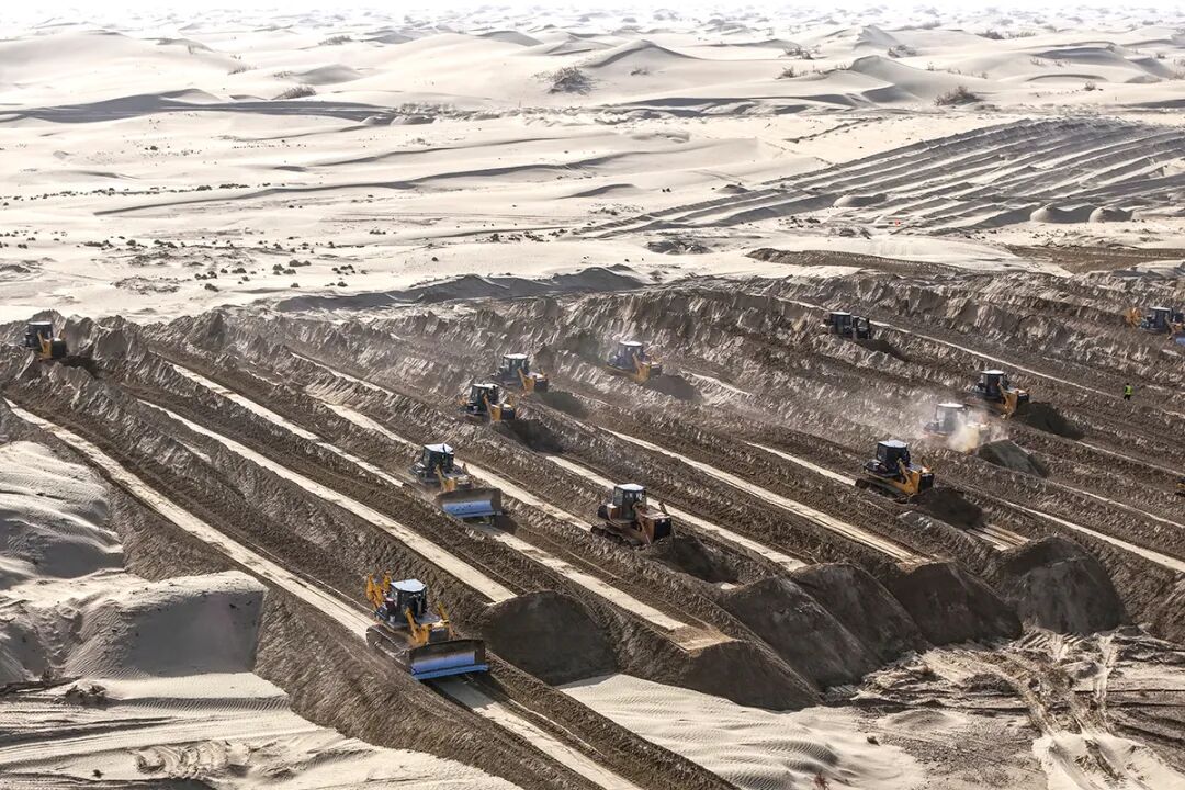 10月23日,正在进行紧张施工的塔里木河干流生态综合治理项目现场。塔里木河流域生态保护和修复项目建设内容包括人工造林1.25万亩,封沙育林工程3.5万亩,退化林修复1.5万亩,人工种草0.3万亩等。项目完成后将极大改善这里的生态环境。 任海霞 摄