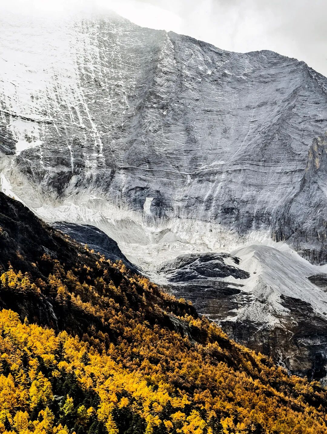 稻城亚丁景区秋景,雪山与彩林相互映衬。