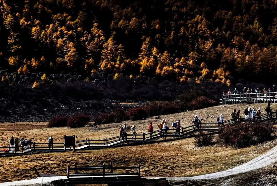 在稻城亚丁景区,游人沿着步行栈道靠近央迈勇雪山。