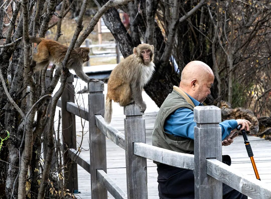 在稻城亚丁景区休息的游客和藏酋猴。