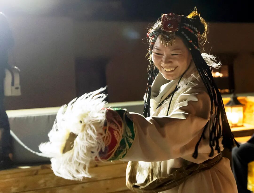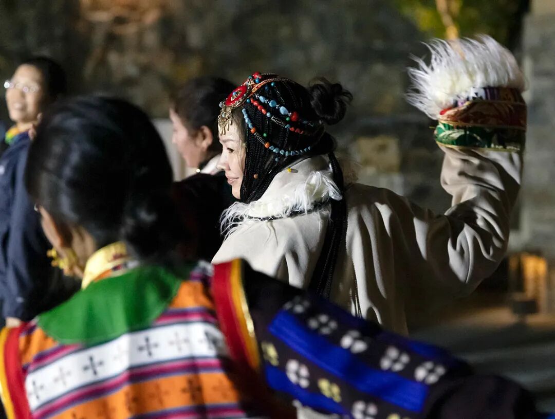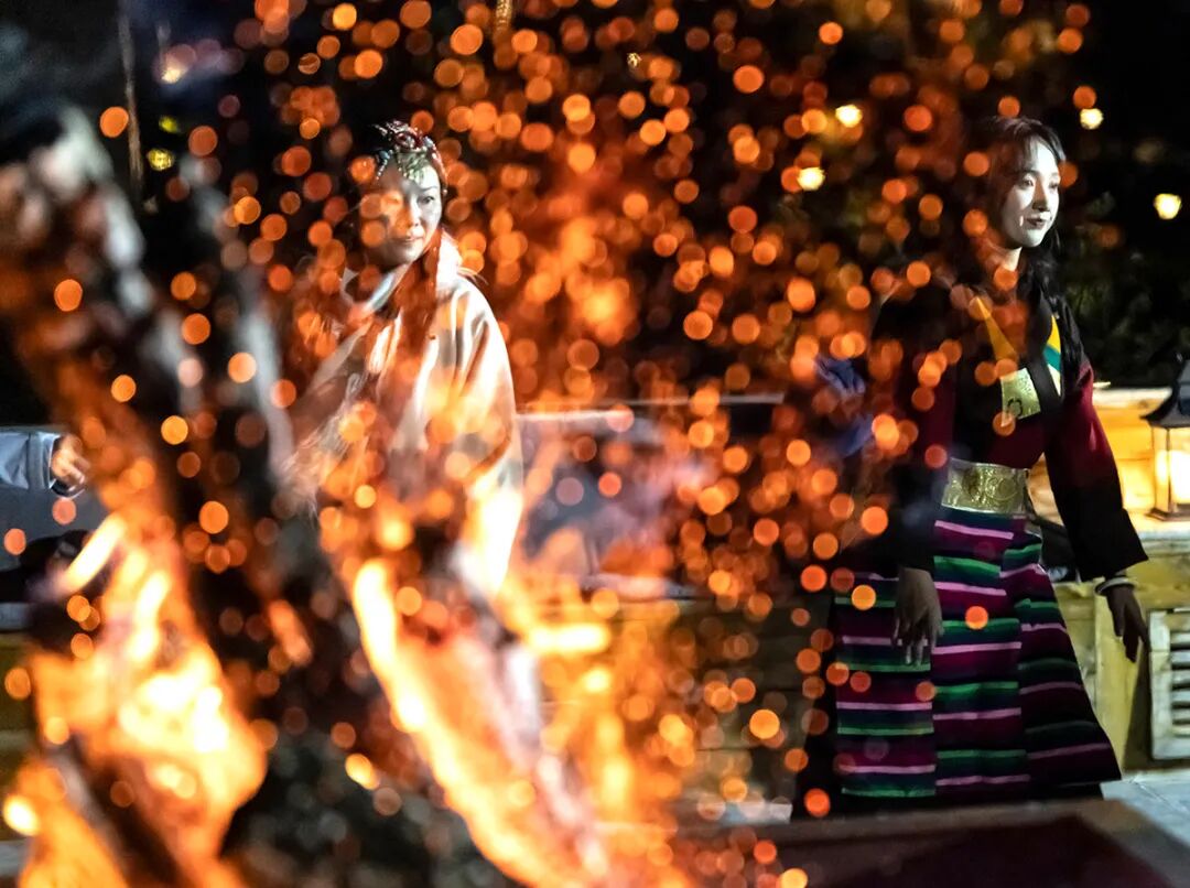 在乡城县博康噶布乡村民宿,身着传统服饰的当地居民围着篝火跳起锅庄舞。